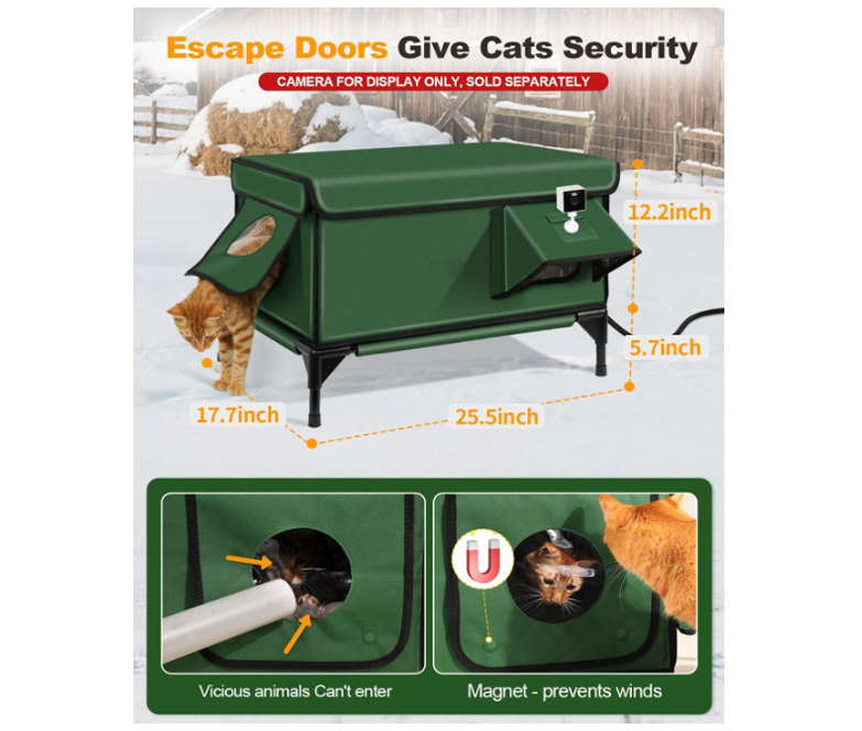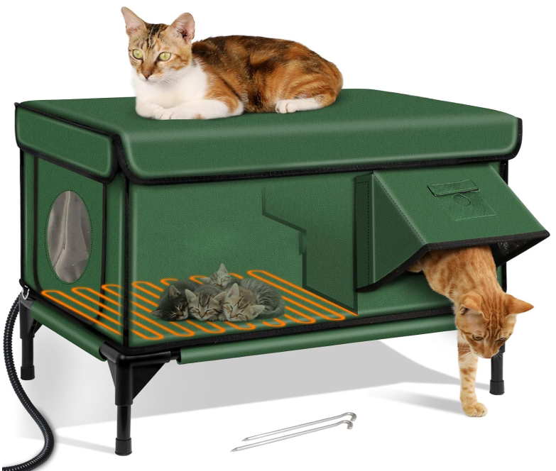 Keep outdoor and stray cats warm through winter with this weatherproof heated cat house, designed in a cozy lodge style. Made from durable Oxford cloth, it features an insulated structure, a safe escape door, and a built-in heated cat bed to provide consistent warmth. Measuring 17.7″ D ร— 25.5″ W ร— 17.9″ H, this green outdoor shelter offers a secure, comfortable, and protected space for cats to rest in cold or harsh weather.