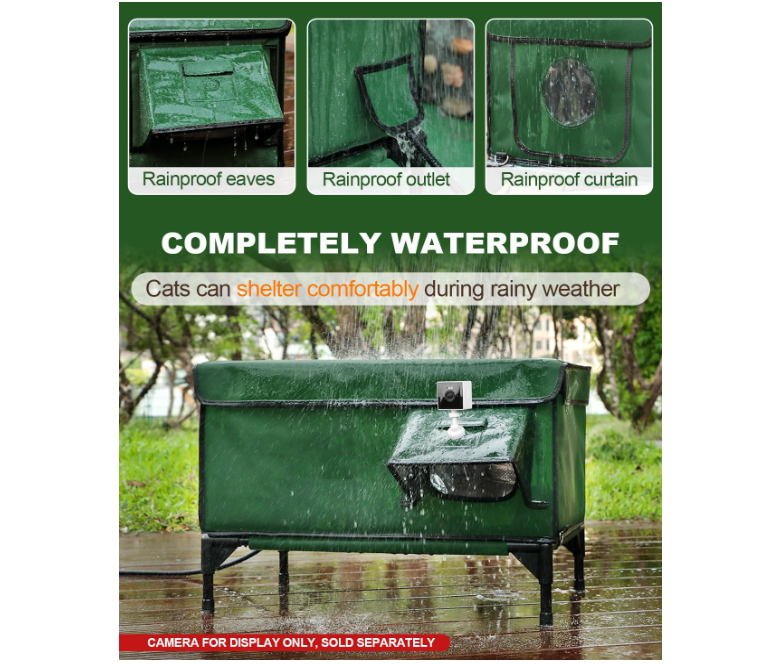 • ๐—ช๐—ถ๐—ป๐—ฑ ๐—ฎ๐—ป๐—ฑ ๐—ฅ๐—ฎ๐—ถ๐—ป ๐—ฅ๐—ฒ๐˜€๐—ถ๐˜€๐˜๐—ฎ๐—ป๐˜: The elevated, off-ground design of this heated cat bed outdoor prevents moisture buildup. Its heating pad outlet, eaves, roof, and escape door are all waterproof, built to withstand wind and rain. This fully weatherproof heated cat house ensures that your catโ€™s environment remains dry and comfortable.